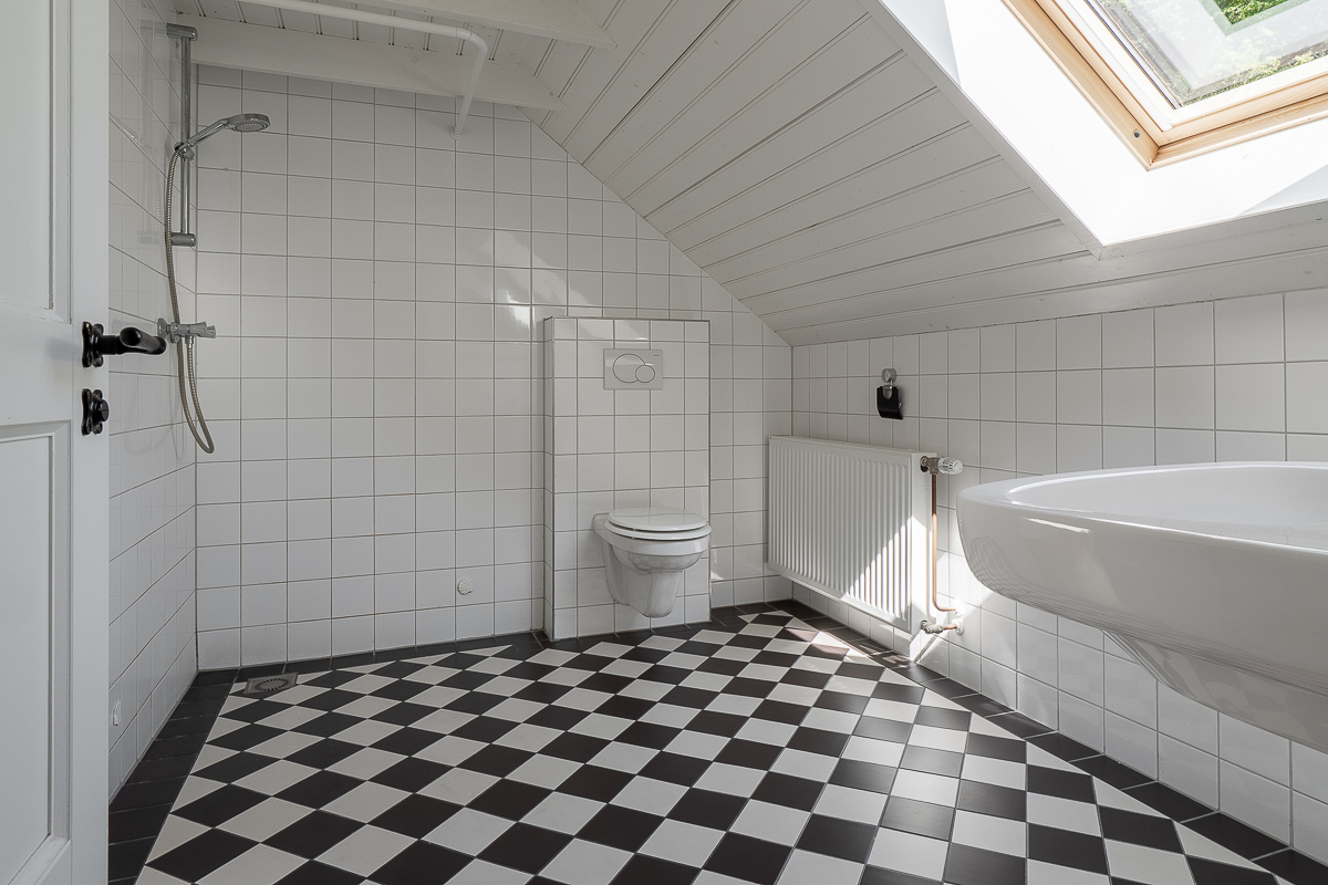 - zijentree/hal met uitstortgootsteen, wasmachineaansluiting, doucheruimte en toiletruimte voorzien van wandcloset en wastafel