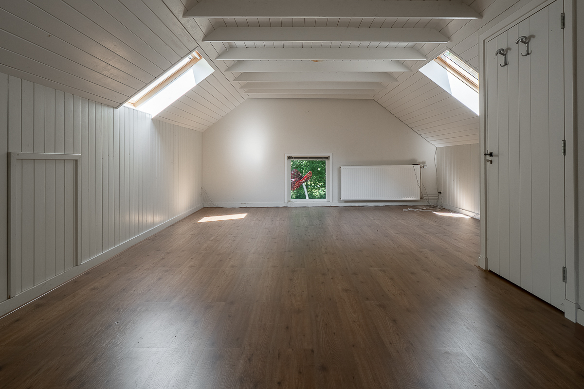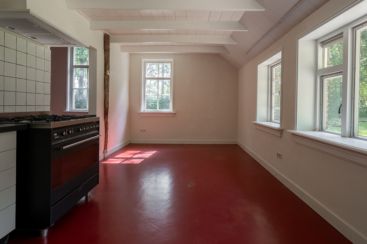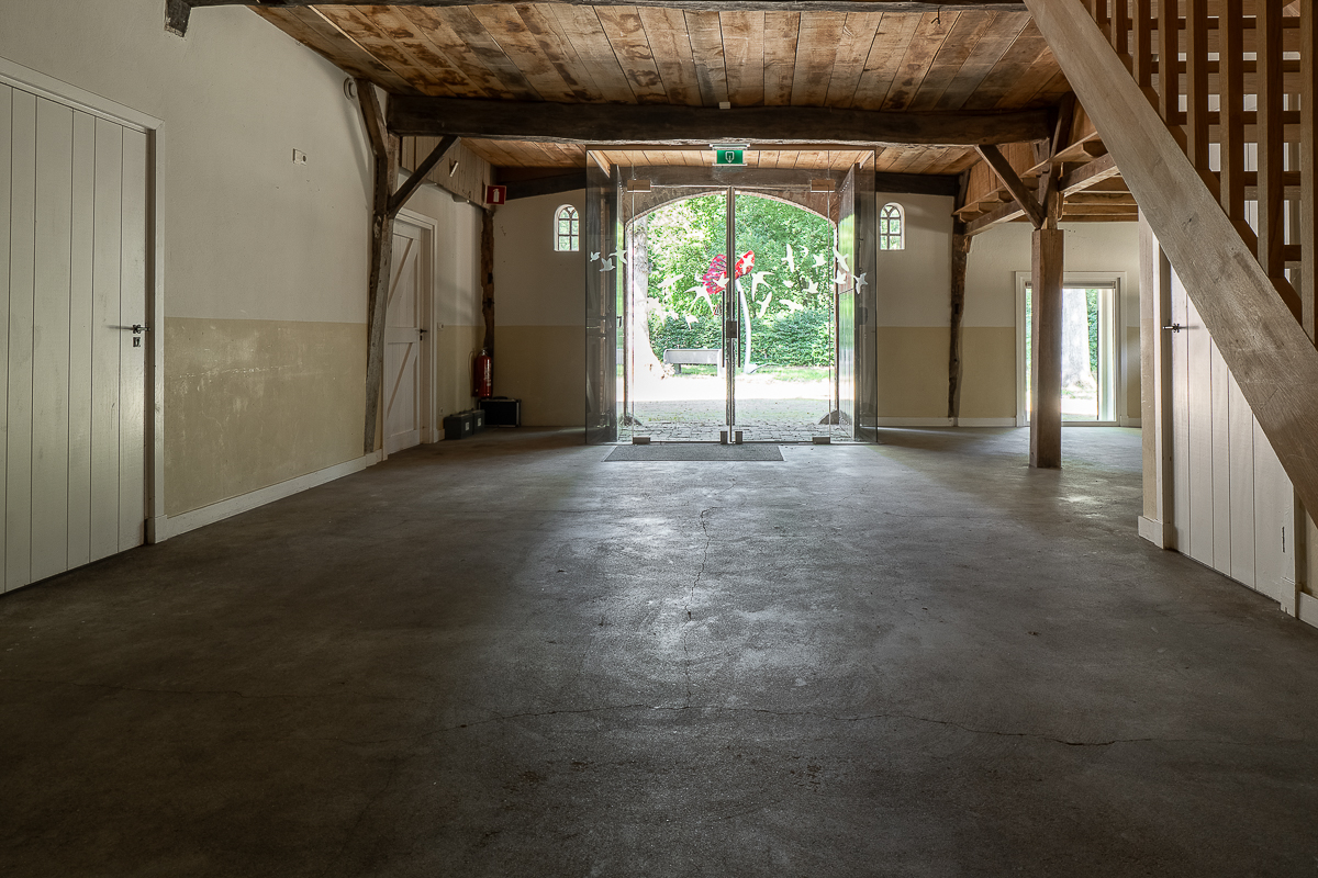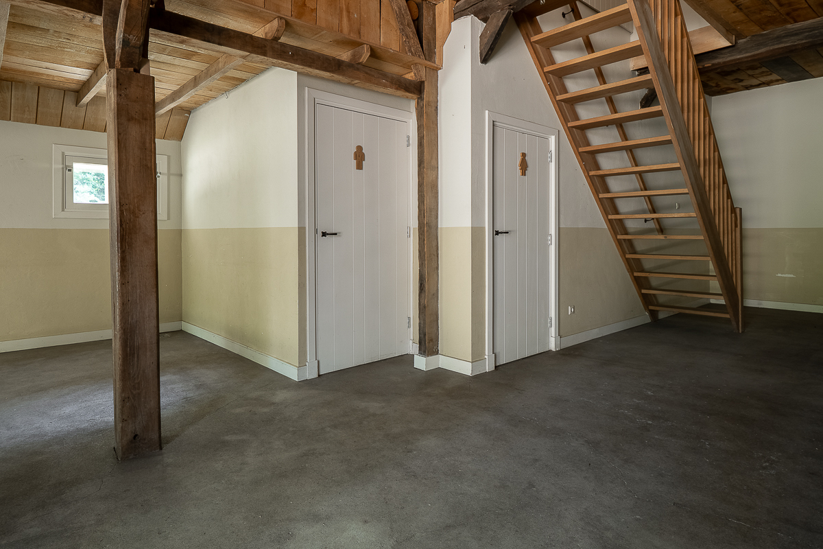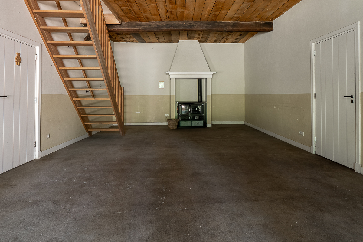 - grote multifunctionele en rolstoeltoegankelijke ruimte met houtkachel/fornuis en open houten trap naar verdieping