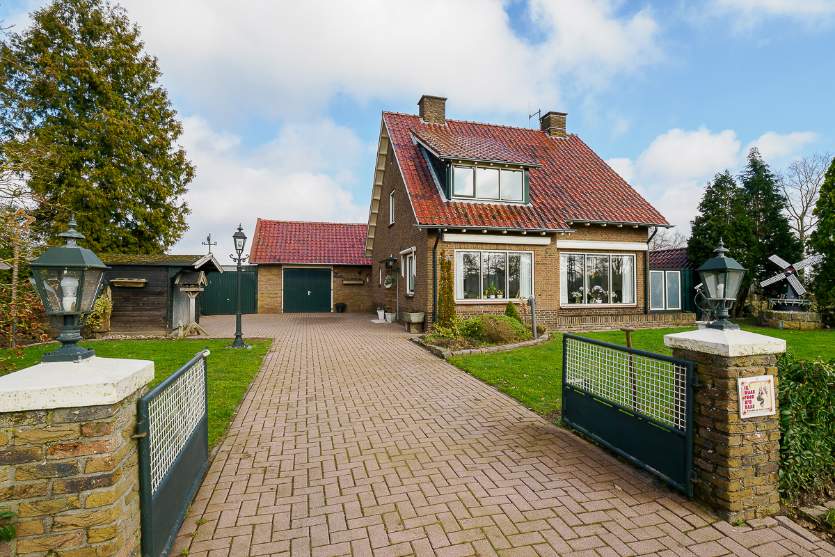 De vrijstaande garage is in dezelfde stijl gebouwd als de woning en aan de linkerkant van de garage is een aanbouw met kanteldeur.
