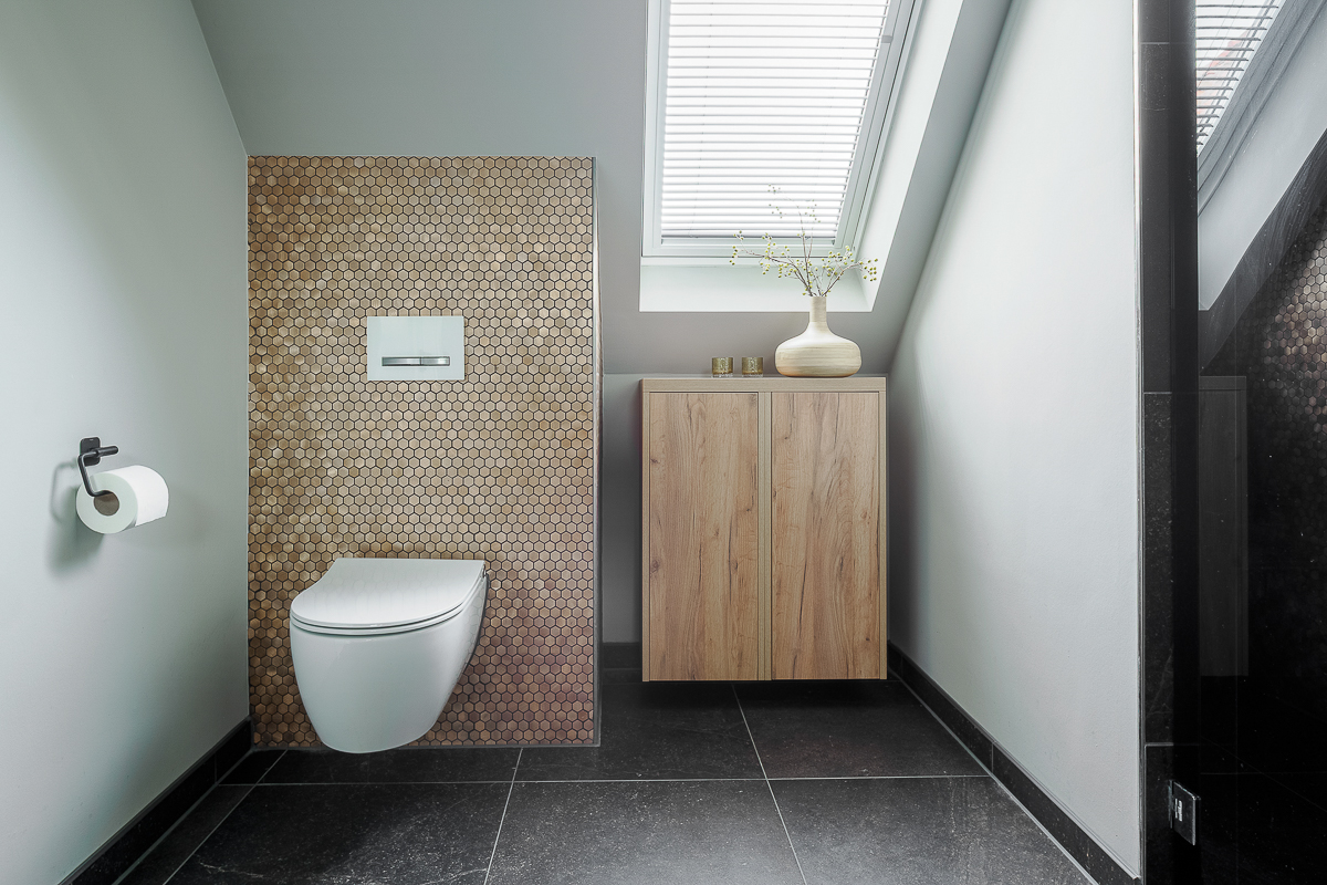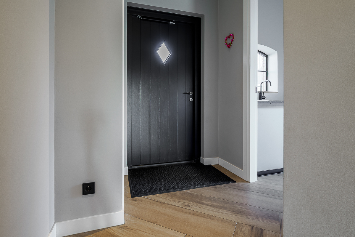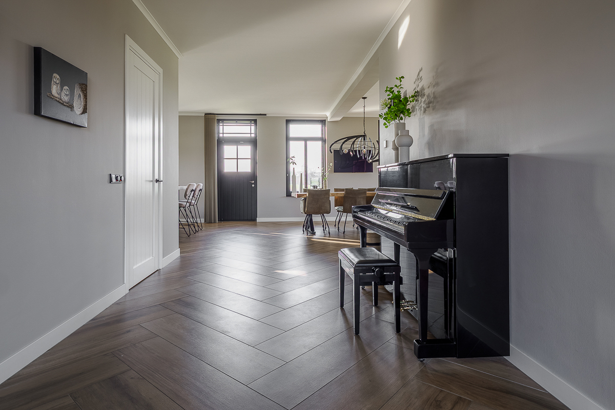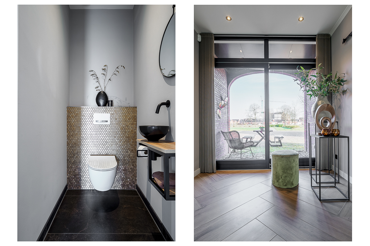 - centrale hal met schuifpui naar overkapping, trapkast, mogelijkheid voor het plaatsen van taatsdeuren en toiletruimte voorzien van wandcloset en designwastafel