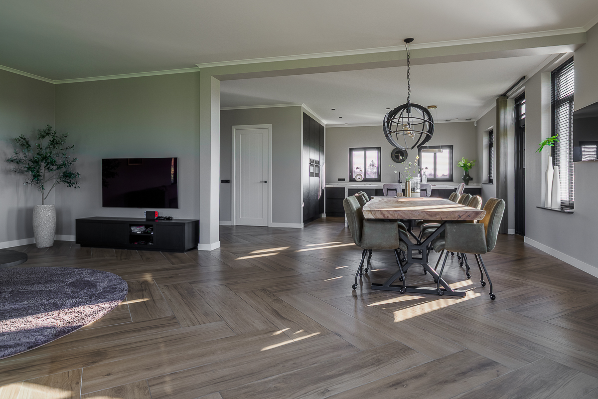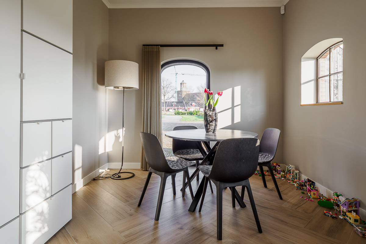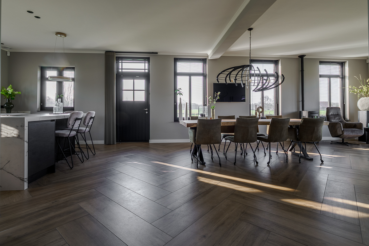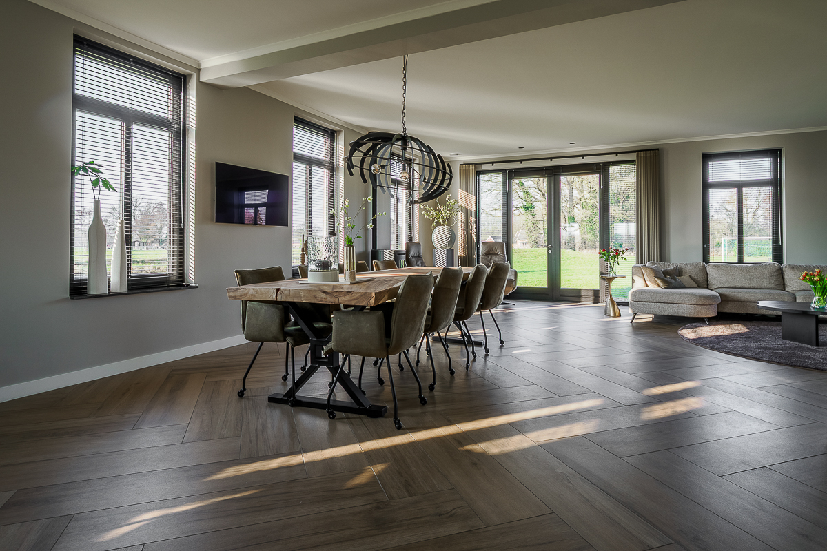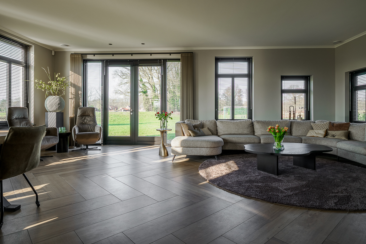 - sfeervolle en royale woonkamer met pelletkachel en openslaande tuindeuren