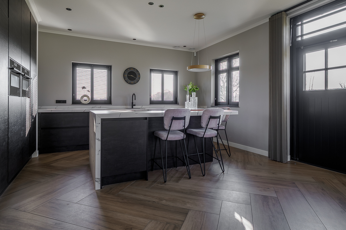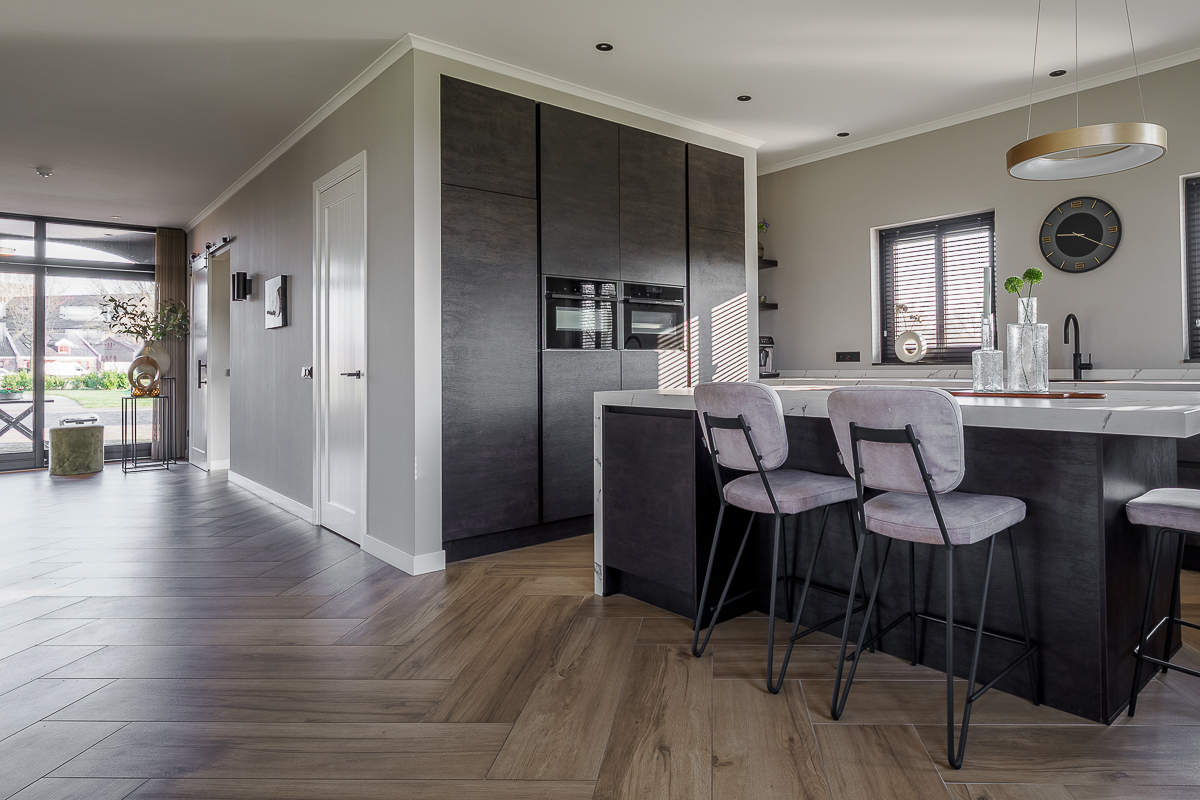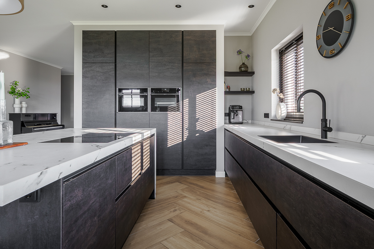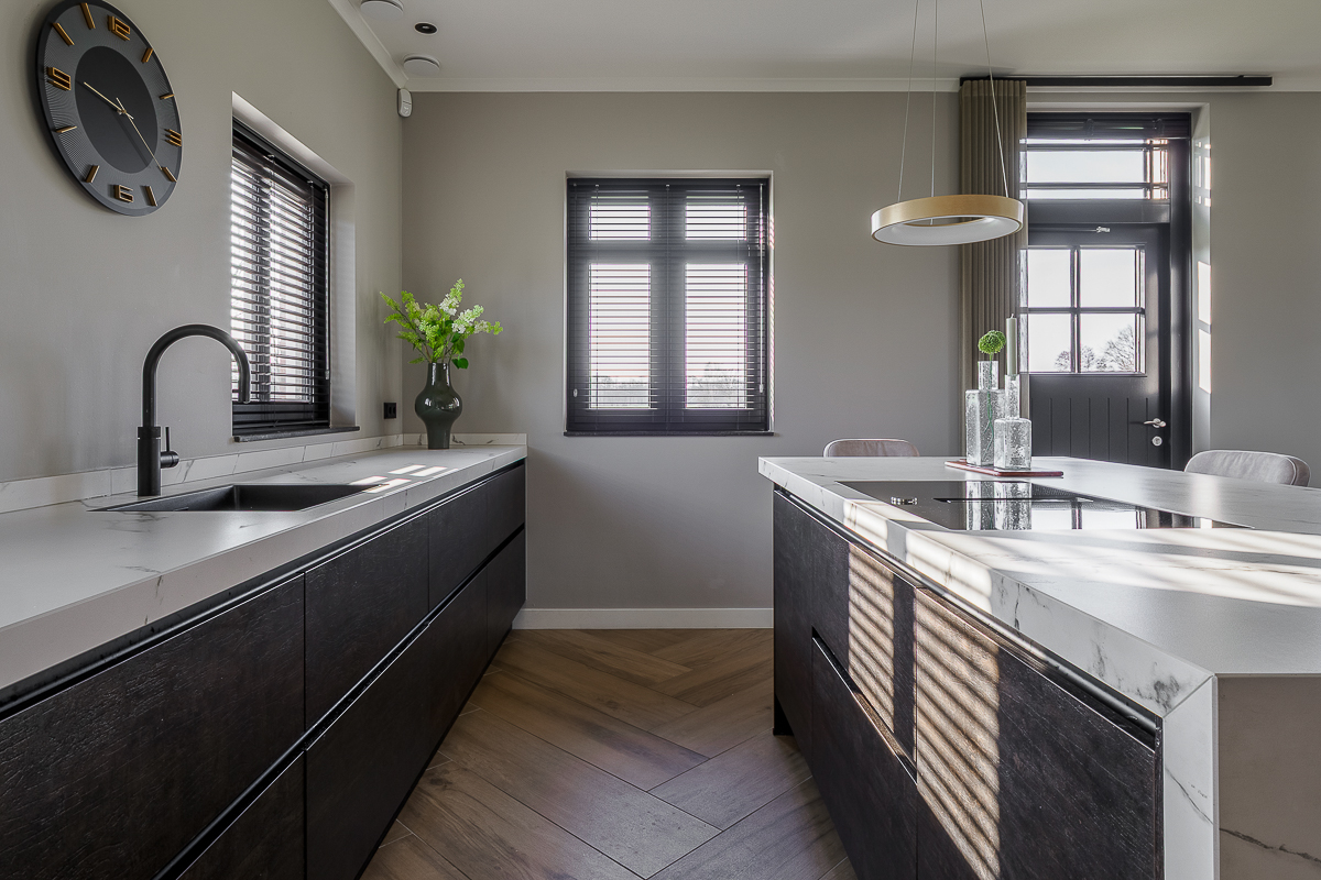 - sublieme keuken met kookeiland, kastenwanden, Dekton keukenbladen en voorzien van inbouwapparatuur: inductiekookplaat met geïntegreerde afzuiging, heteluchtoven, stoomoven, vaatwasser, koelkast met 0-gradenvak, vrieskast en Quooker