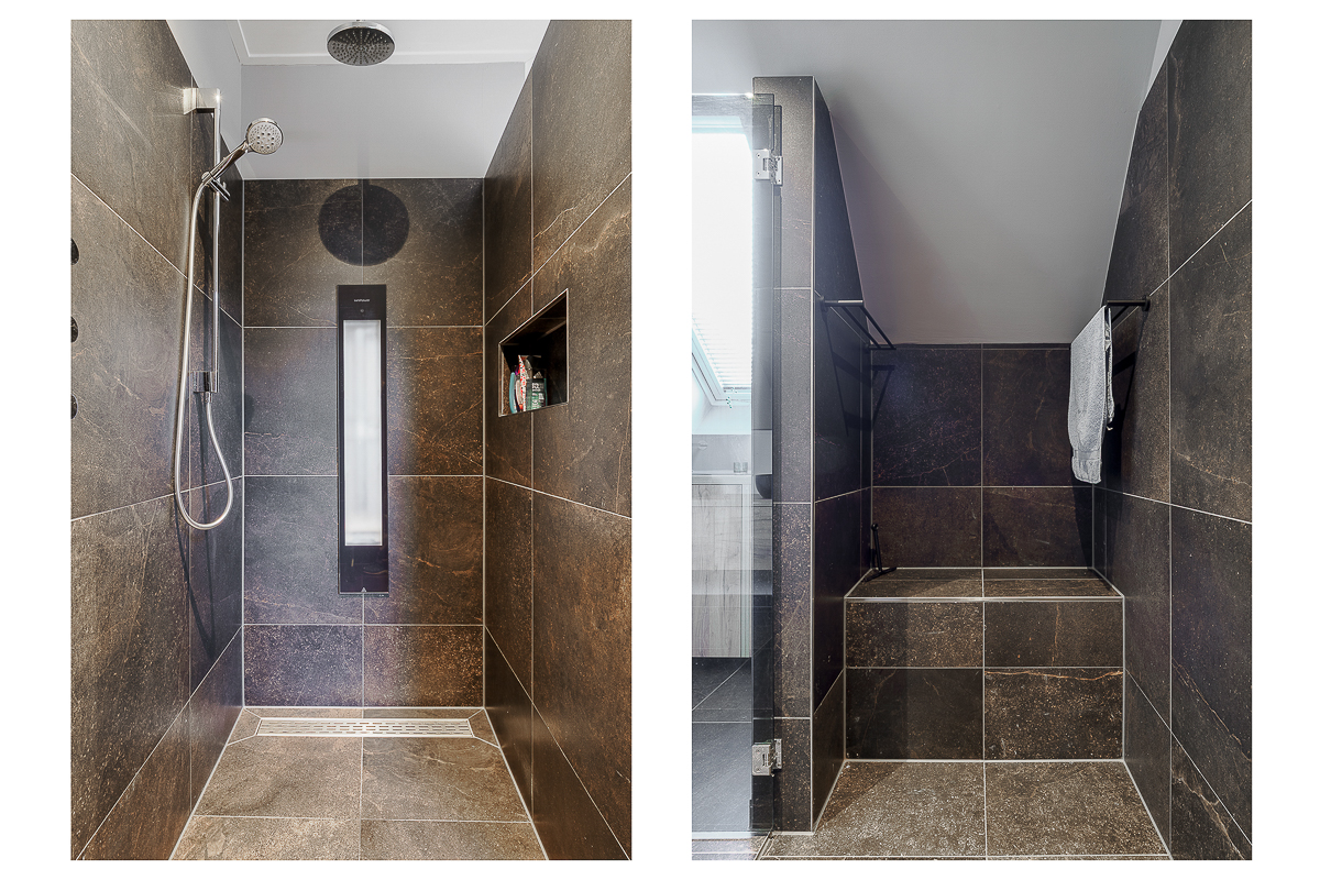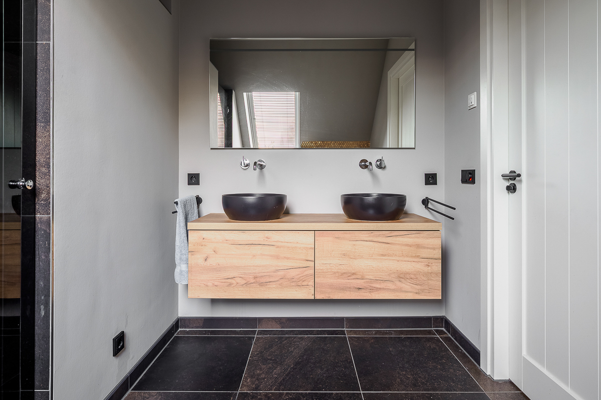 - luxe badkamer met inloopdouche voorzien van sunshower, zitbankje, wastafelmeubel met twee wasbakken en wandcloset