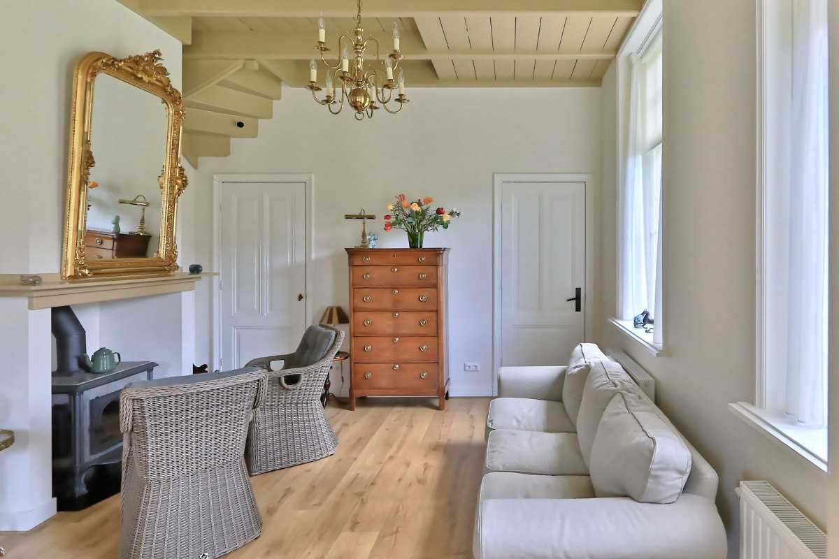- woonkamer met openslaande tuindeuren en schouw met rookkanaal voor houtkachel