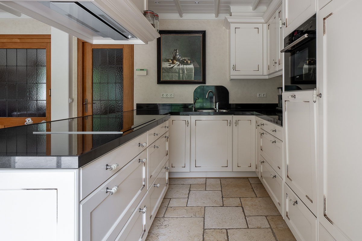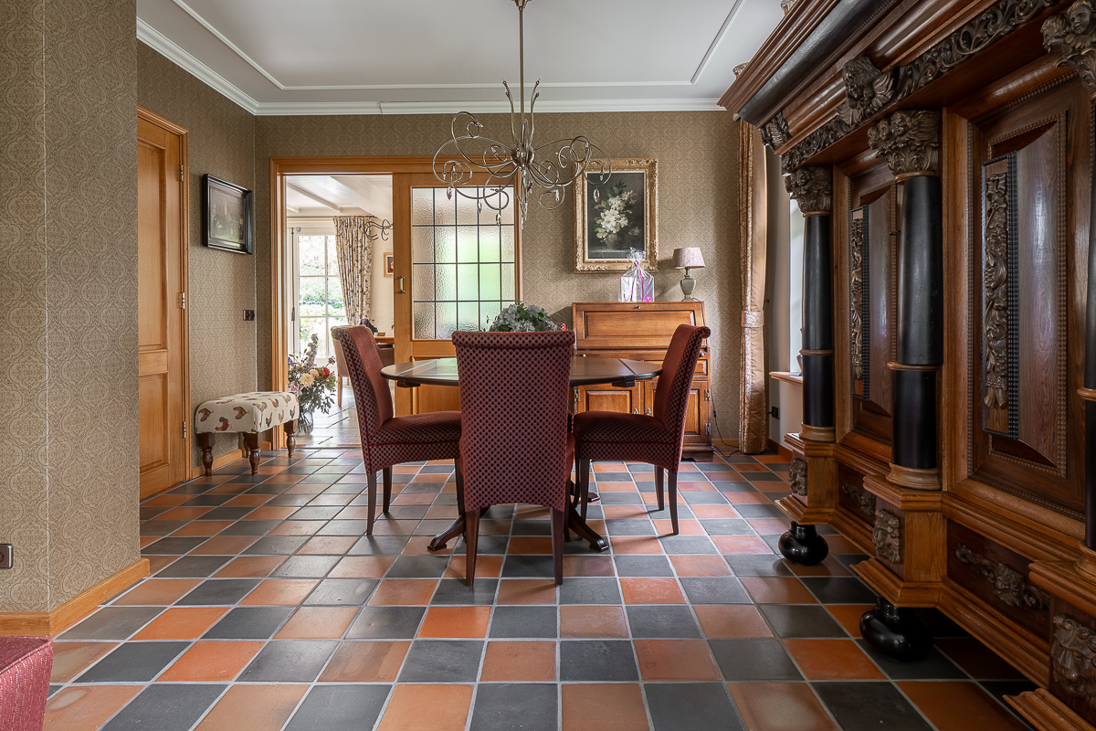Het landhuis is traditioneel gebouwd in 1988, gerenoveerd in 2005, en straalt karakter uit door het gebruik van natuurlijke en duurzame materialen zoals spouwmetselwerk, eiken topgevels en keramische dakpannen. Met een woonoppervlakte van ca. 325 m² (inclusief souterrain), een doordachte indeling en luxe afwerking biedt deze woning alles voor de veeleisende liefhebber van kwaliteit en privacy.