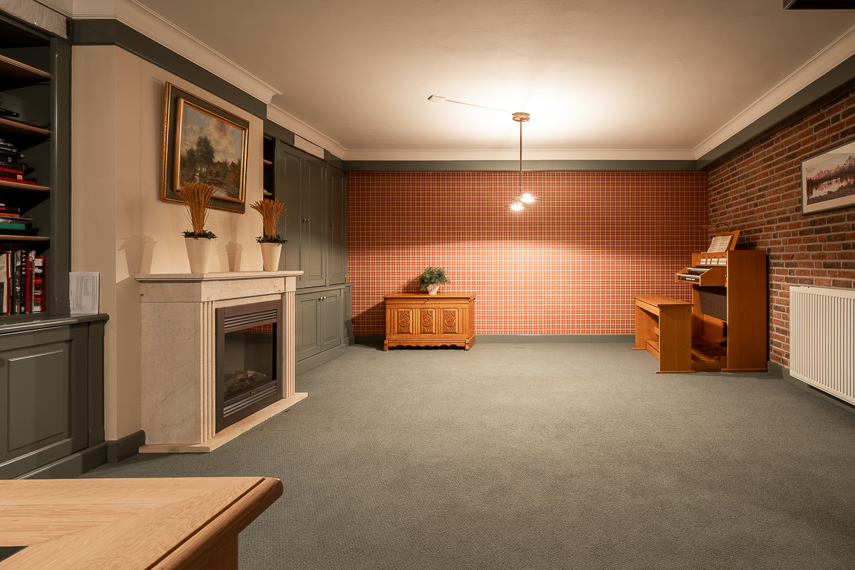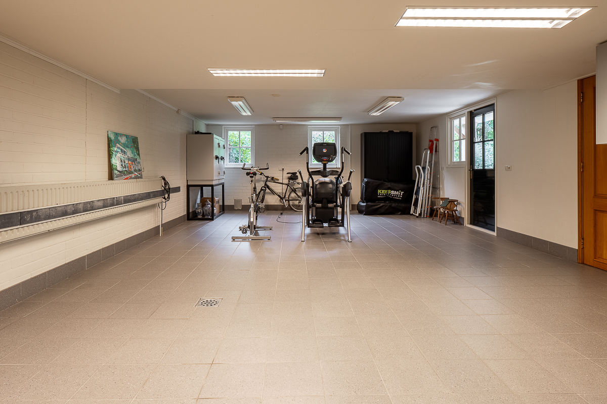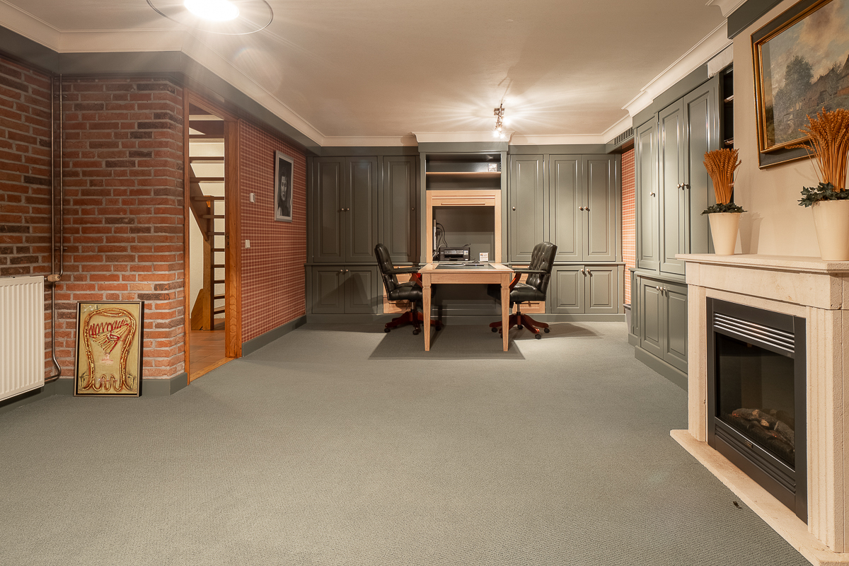 hal met toegang tot provisieruimte, wasruimte, hobby-/fitnessruimte, werkkamer met kastenwanden en schouw voorzien van elektra haard.