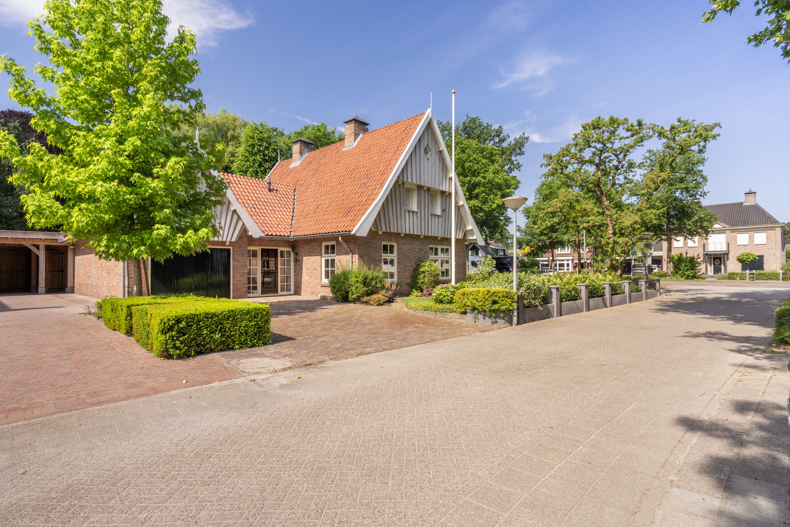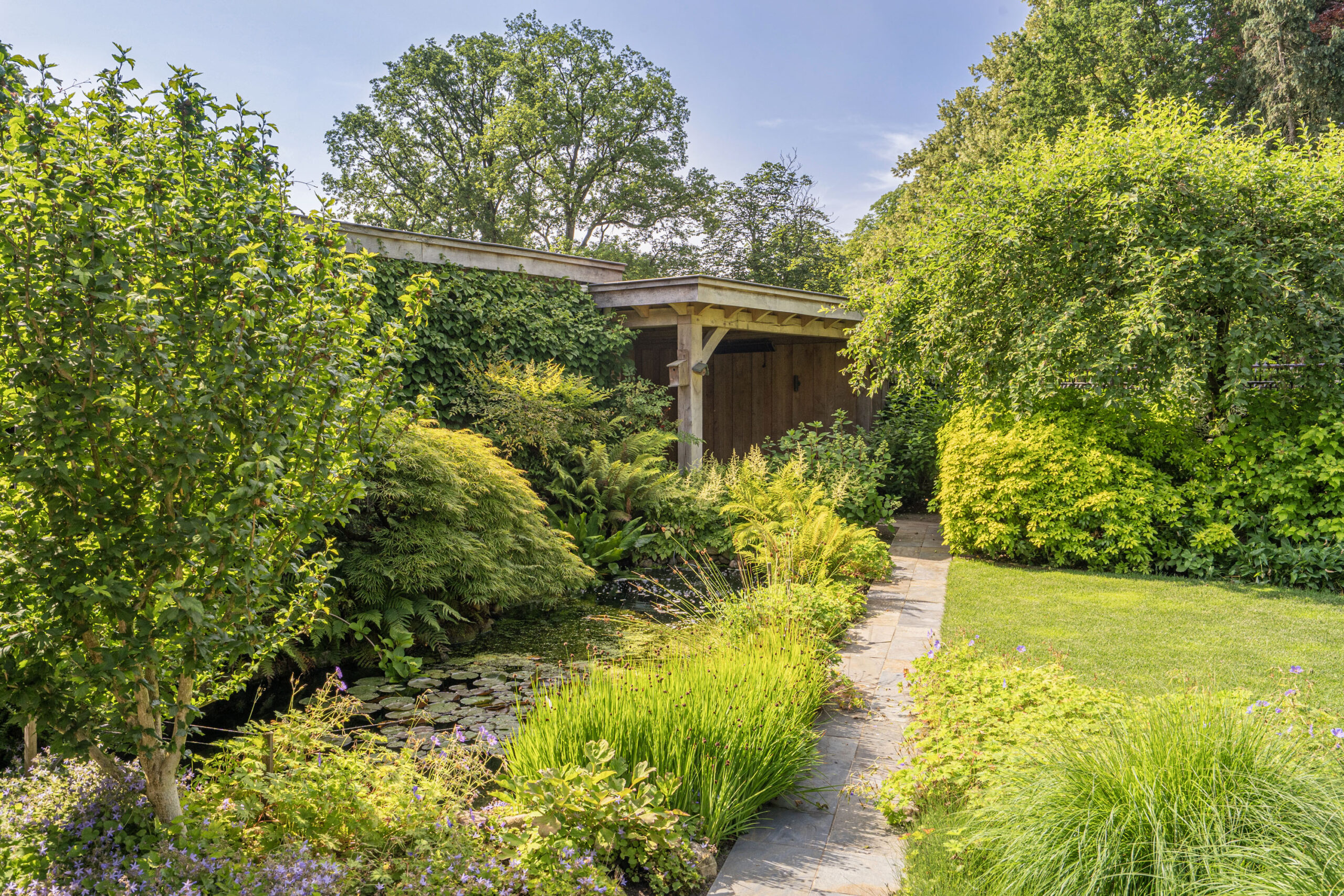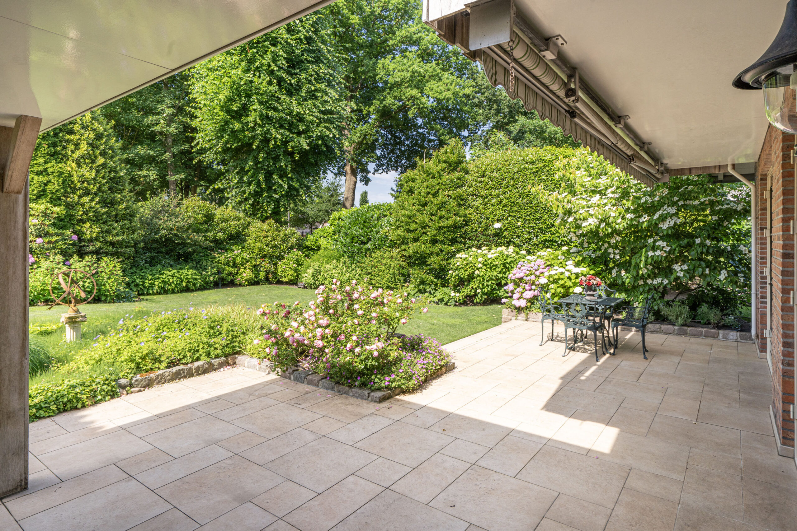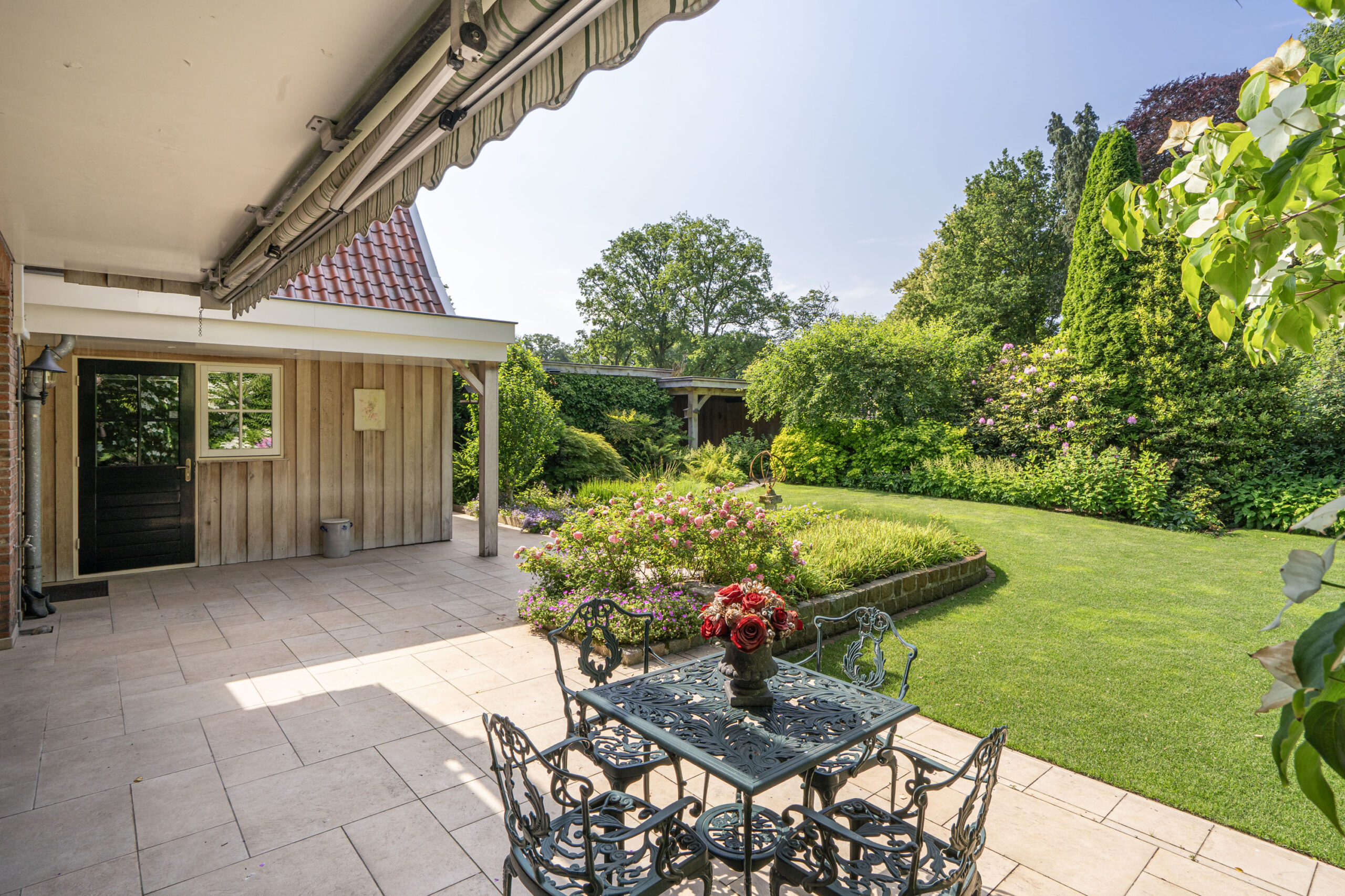 De sierlijk aangelegde tuin is in 2023 volledig vernieuwd en vormt een waar buitenparadijs: fraai aangelegde erfverharding met gebakken klinkers, een stijlvolle overkapping en een fraaie vijverpartij creëren een serene ambiance. Volledig omheind en omsloten door groen biedt de achtertuin een unieke mate van privacy; aan de achterzijde is de woning volledig vrij gelegen.